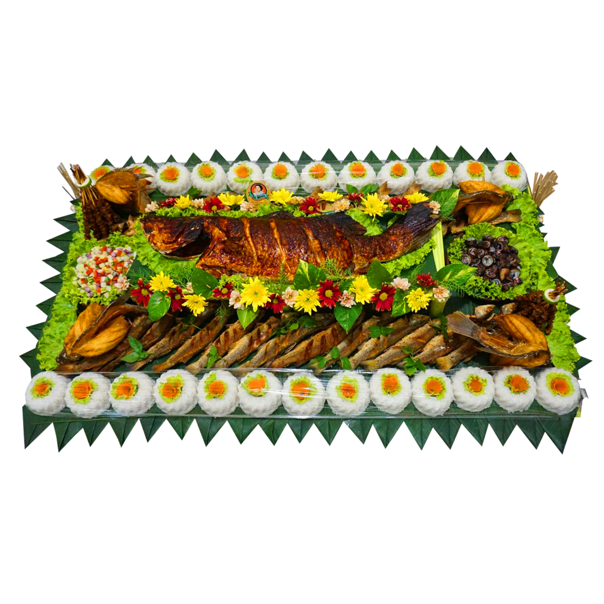Nasi Putih, Gurami Terbang 1/5, Ikan Besar 3kg, Ikan Belanak 1/5, Sate Udang Bakar, Cumi Goreng, Sate Kerang, Urap-Urap, Mie Goreng, Lalapan, Aneka Sambal (Kacang, Bawang, Dabu)